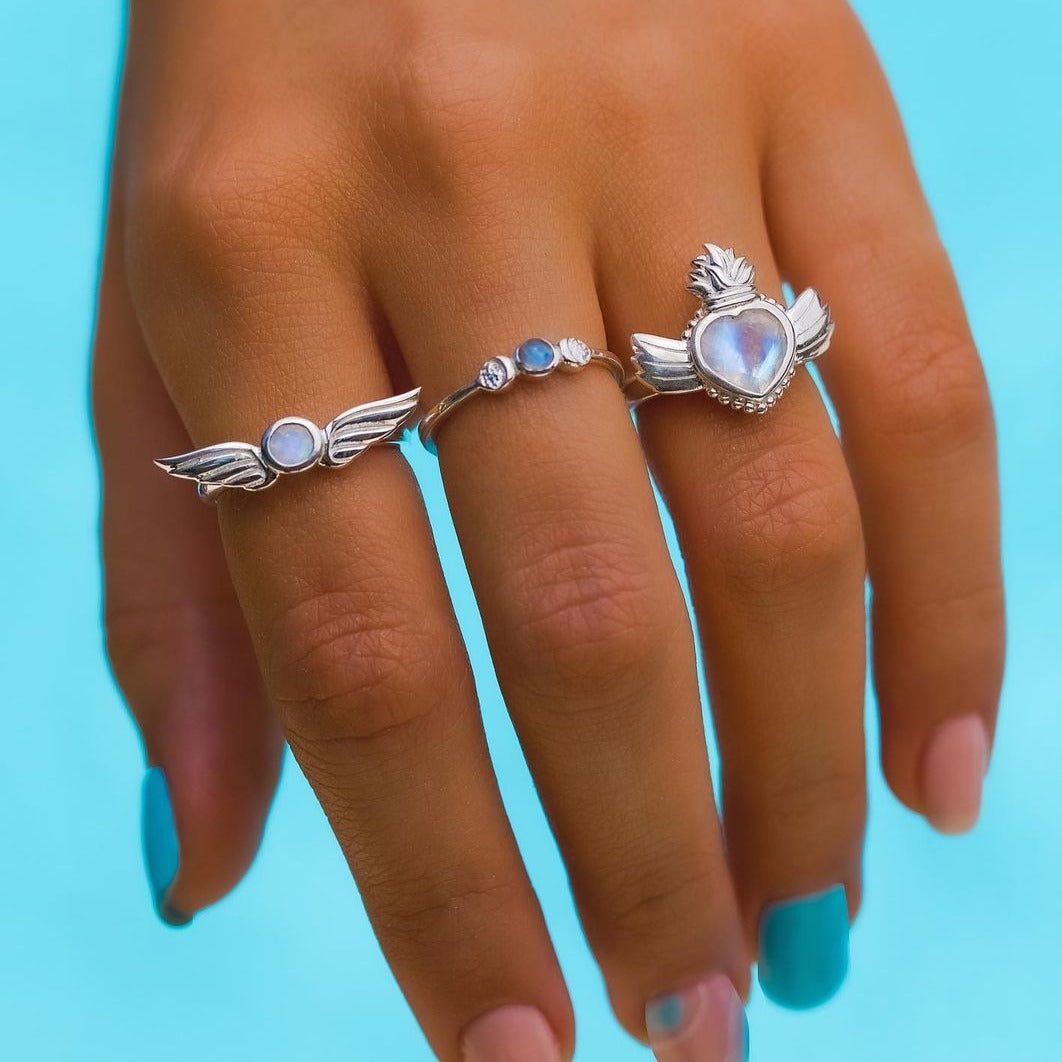 Desata su gracia angelical con esta línea premium Alas de Angel piedra luna. Meticulosamente elaborado, este anillo presenta detalles delicados de ala de ángel que evocan una sensación de belleza celestial y encanto etéreo. La pieza central del anillo está adornada con una piedra lunar, simbolizando la intuición y la feminidad divina.