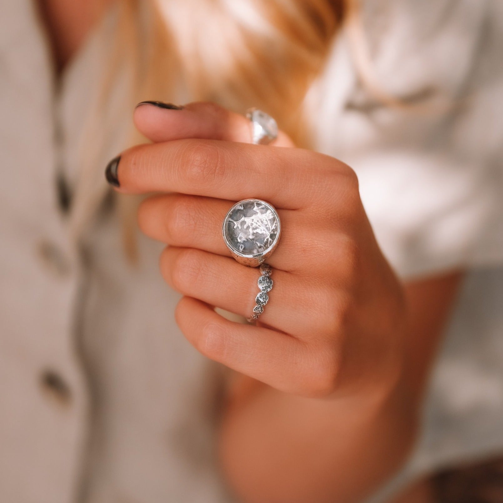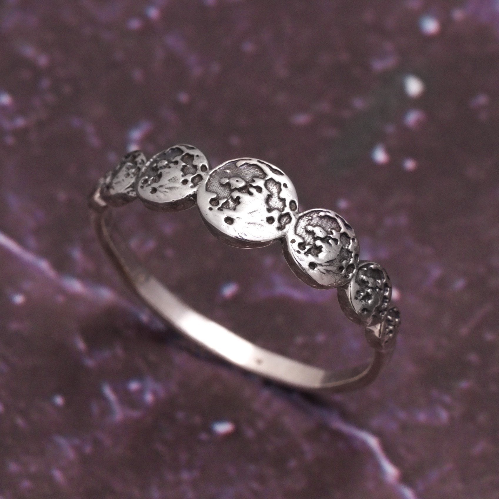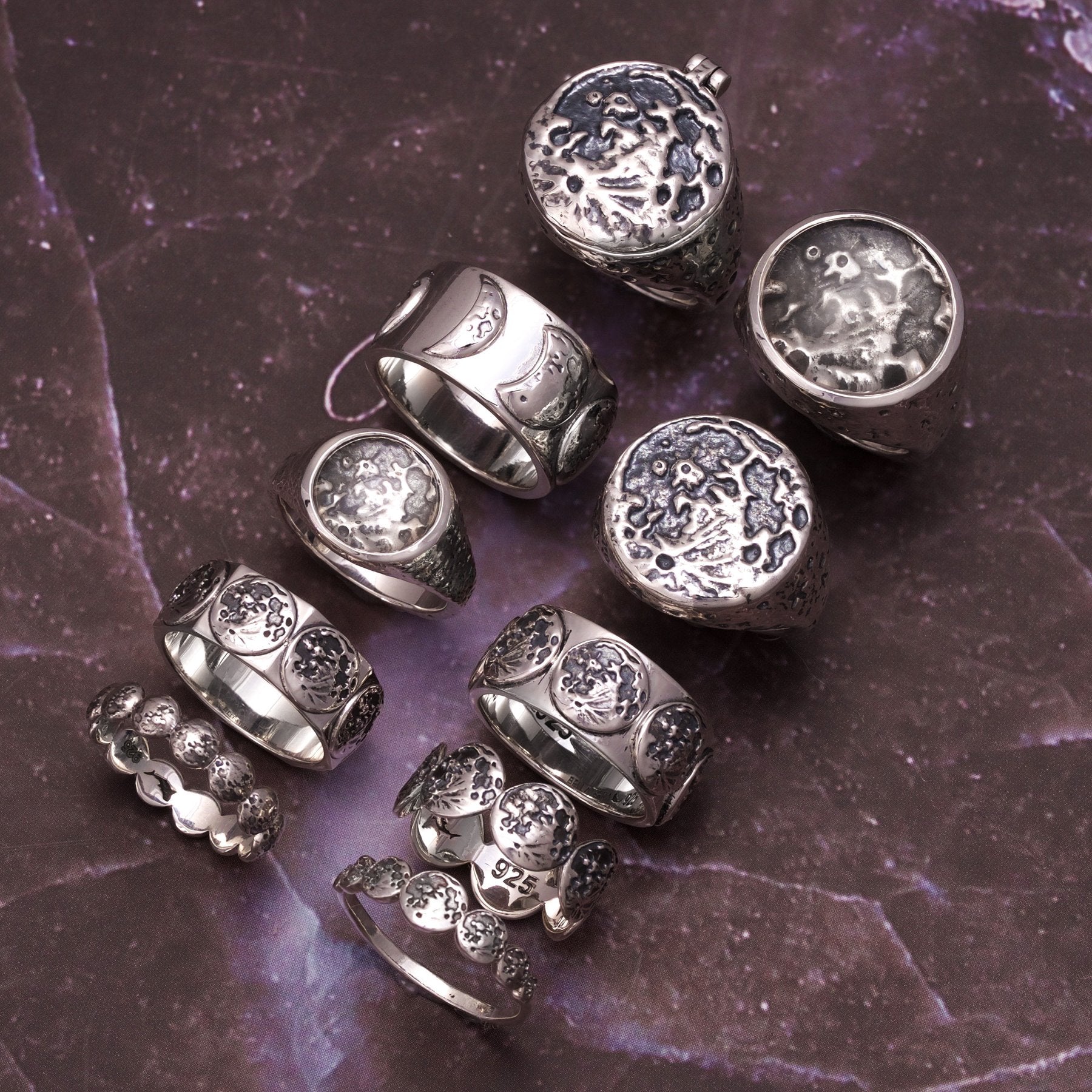 Abraza la belleza celestial del ciclo lunar con nuestro anillo lunar petit. Esta delicada pieza de joyería inspirada en la luna captura la esencia de las fases lunares con su diseño celestial. La sutil elegancia del anillo lo convierte en un accesorio versátil y sofisticado, perfecto para agregar un toque de encanto celestial a cualquier atuendo. Hecho a mano con una atención precisa al detalle, el anillo muestra las diferentes fases de la luna, creando un efecto fascinante y encantador. El estilo minimalista del anillo lo convierte en una pieza atemporal y elegante que complementará cualquier estilo.