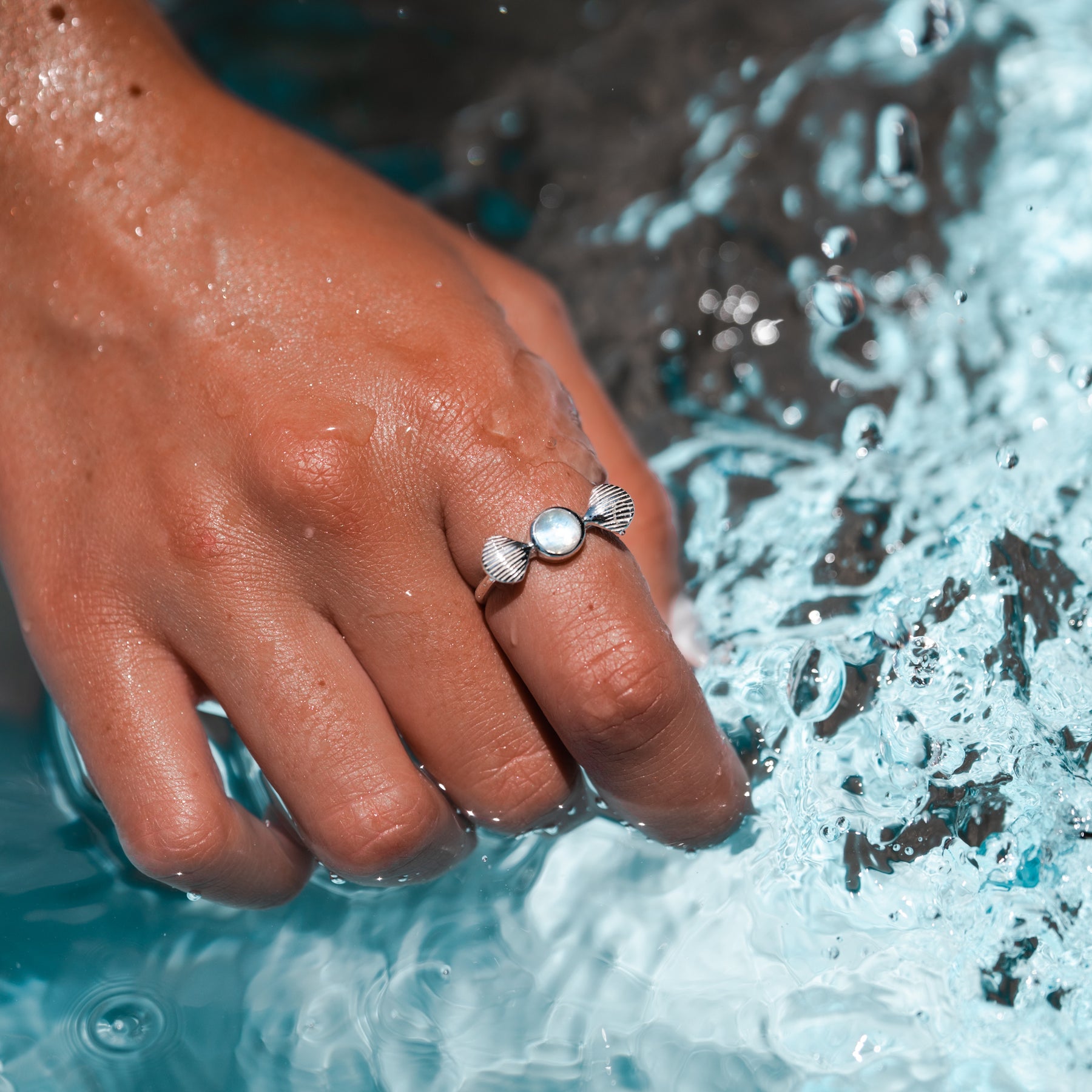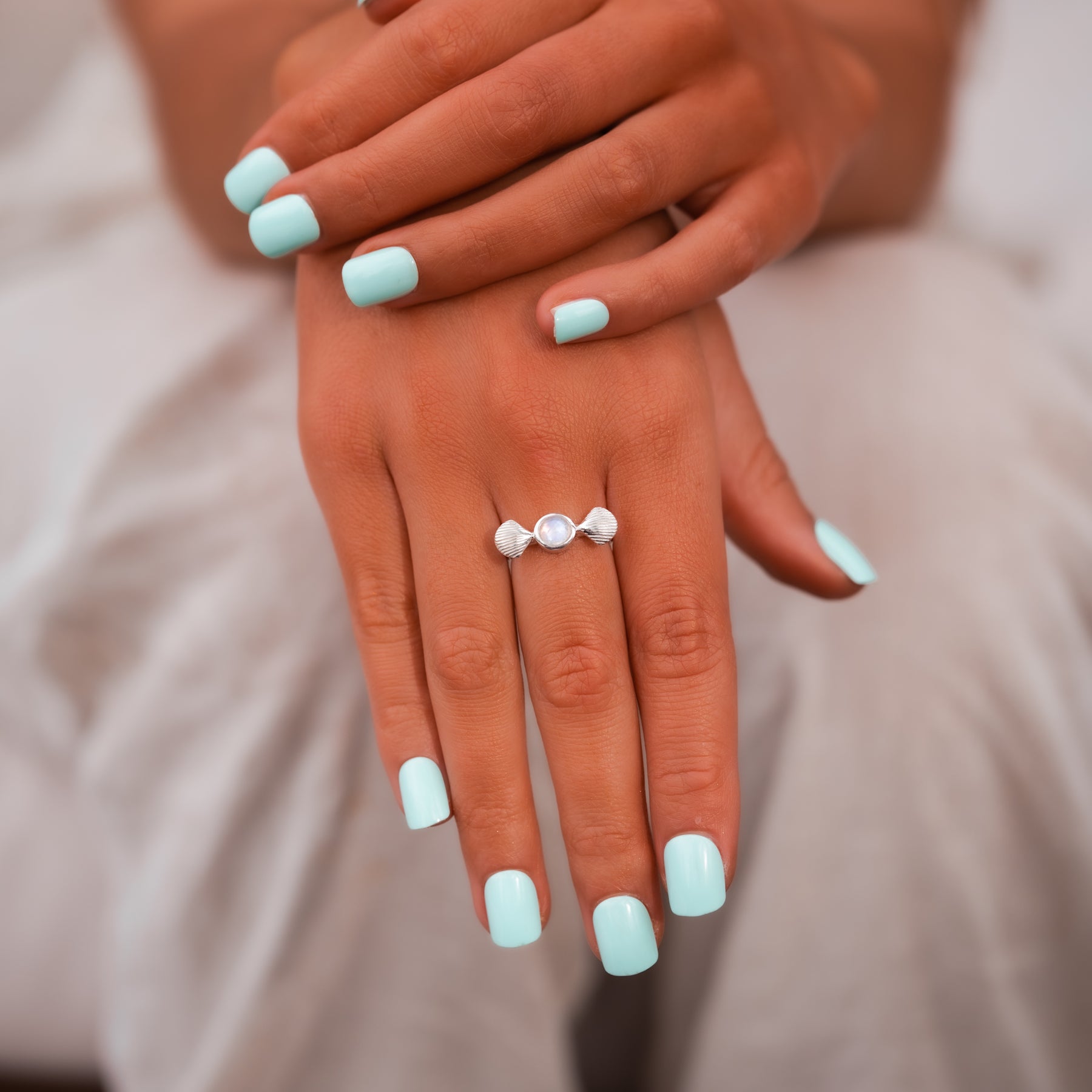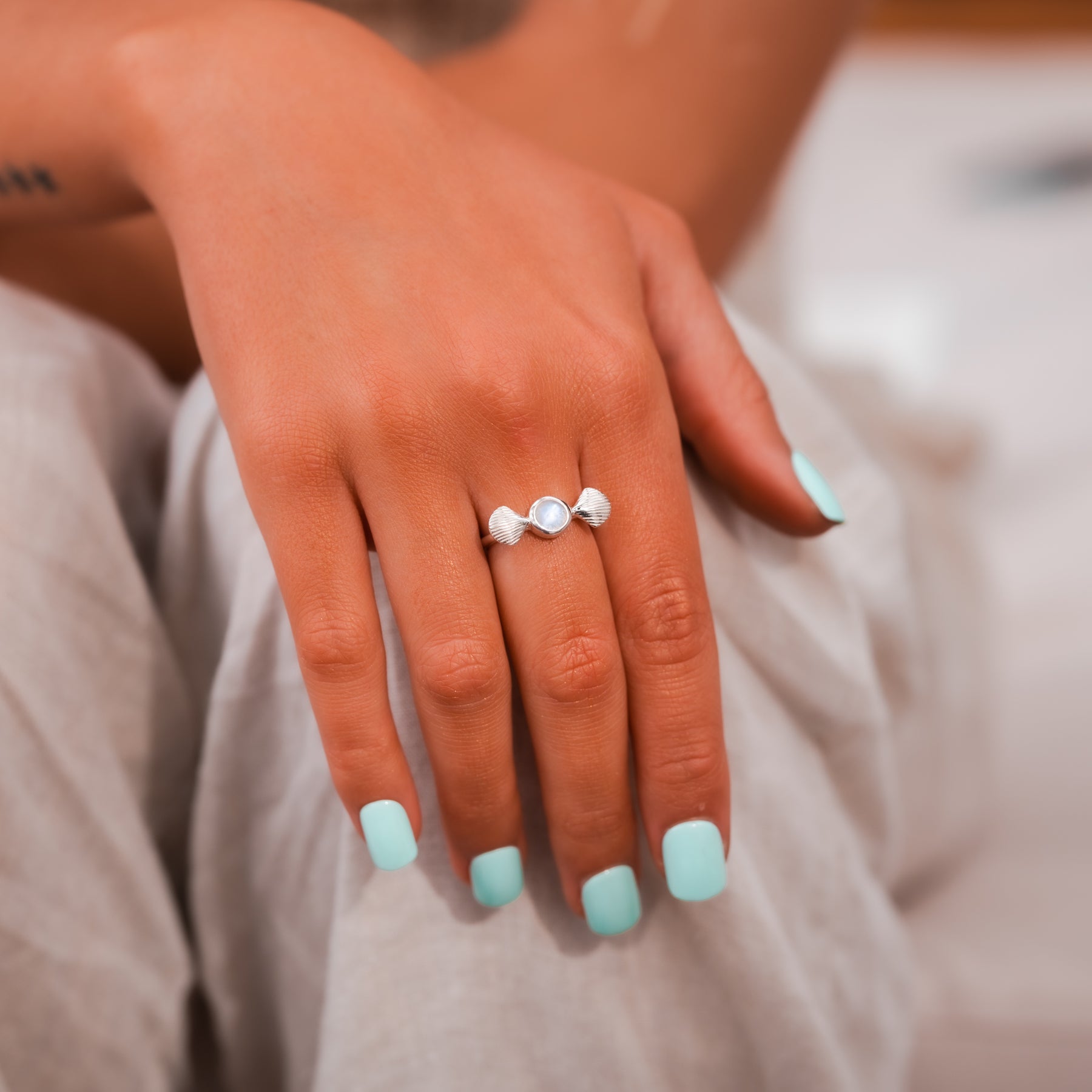 Disfrute de la elegancia costera con este anillo línea premium Conchitas piedra luna. Elaborado por expertos, este anillo muestra la intrincada belleza de las conchitas marinas adornadas con una pieza central de piedra lunar. La combinación de las conchas orgánicas y la piedra lunar iridiscente crea una mezcla armoniosa de encanto inspirado en la naturaleza y encanto etéreo.