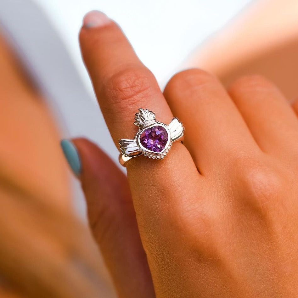 Descubre nuestro exclusivo anillo de plata 925 con ala protectora y amatista, de nuestra línea premium. Este elegante y artesanal anillo combina el encanto del diseño alado con la belleza natural de la amatista. Ideal para lucir en verano y agregar un toque moderno a tus conjuntos. Hecho a mano con cuidado y atención a los detalles.