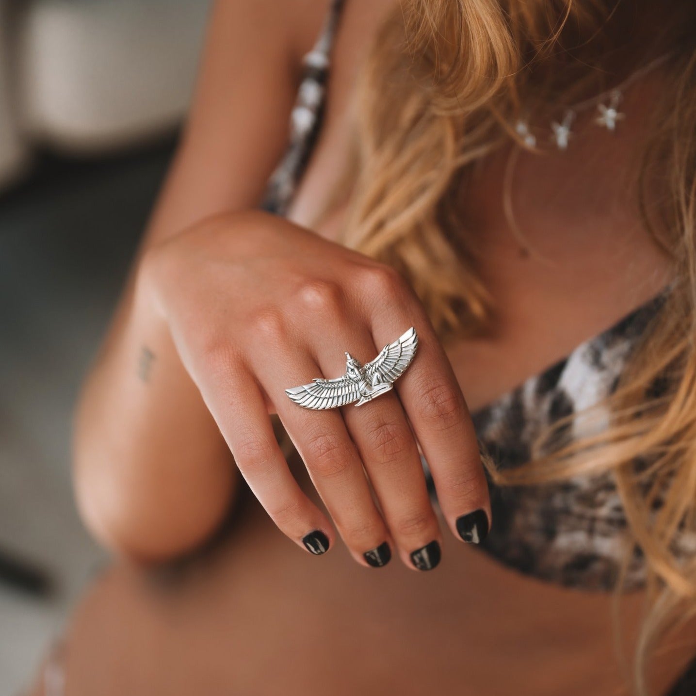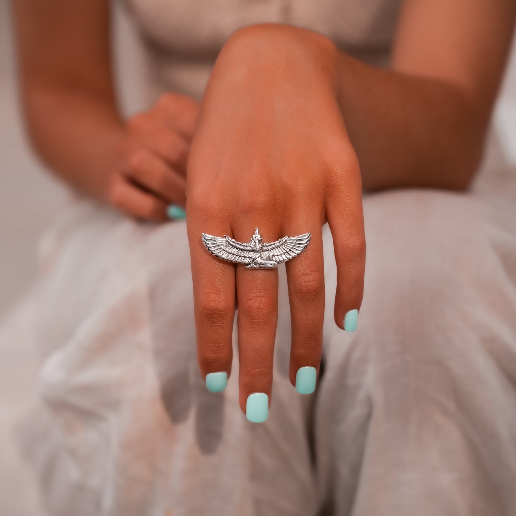 Abraza el encanto de la cultura egipcia antigua con nuestro majestuoso anillo de ISIS de la línea premium. Hecho a mano con intrincada precisión, este anillo de plata 925 captura la esencia cautivadora de la venerada diosa egipcia. Su diseño cautivador muestra una elegancia real que simboliza el poder y la belleza. Con su estilo único y exquisito, se destaca como una distinguida pieza de joyeria, rinde homenaje a la riqueza del arte y la cultura egipcia.