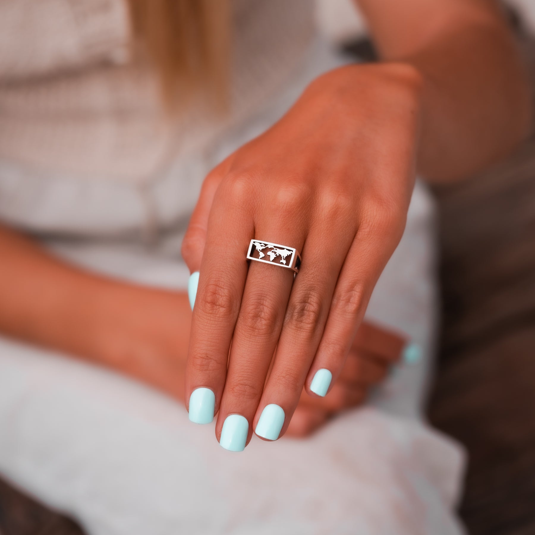 Descubre la belleza del mundo con nuestro Anillo Mapamundi Rectangular de la Línea Premium. Este anillo plateado presenta un diseño de mapamundi detallado en una forma rectangular elegante. Es una pieza sofisticada que celebra el espíritu de aventura y descubrimiento. ¡Lleva el mundo en tus manos con este anillo premium!