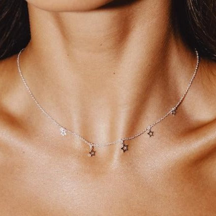 Mejora tu estilo misterioso y único con nuestra gargantilla Estrellas fantasma. Esta impresionante gargantilla de plata .925 presenta un diseño de estrellas que parecen salir de la oscuridad, dándote un toque mágico y enigmático. Perfecto para llevar la energía de las estrellas contigo durante el verano. Hecho a mano con plata .925 de alta calidad, esta gargantilla le proporcionará un aspecto sofisticado y encantador.